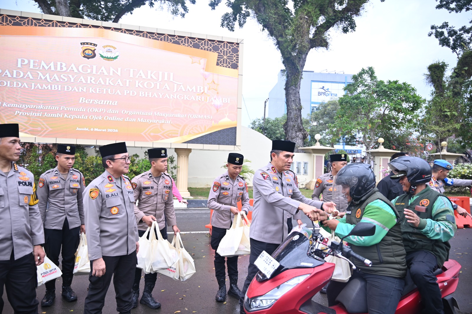 Dalam kegiatan tersebut, Kapolda Jambi bersama Bhayangkari, OKP dan Ormas secara langsung membagikan takjil berupa makanan dan minuman kepada para pengemudi ojek online serta masyarakat yang melintas di sekitar Mapolda Jambi. Kegiatan ini disambut antusias oleh masyarakat yang menerima takjil untuk berbuka puasa.