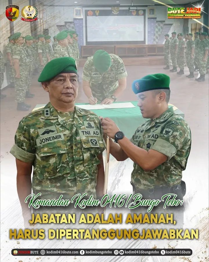 Bungo, Sentralinfo.com – Letkol (Har) Arm Joneimir, S.H, resmi menjabat Perwira Penghubung (Pabung) Kodim 0416/Bute, acara laporan penerimaan langsung di Pimpin oleh Komandan Kodim (Dandim) 0416/ Bute Letkol Inf Yudi Susilo Yudhanto, S.E., M.P.A, yang bertempat di Aula Sudirman Makodim 0416/Bute, Jl. Perwira No. 1, Kelurahan Bungo Barat, Kecamatan Pasar Muara Bungo, Kabupaten Bungo, Jumat (17/04/2026).